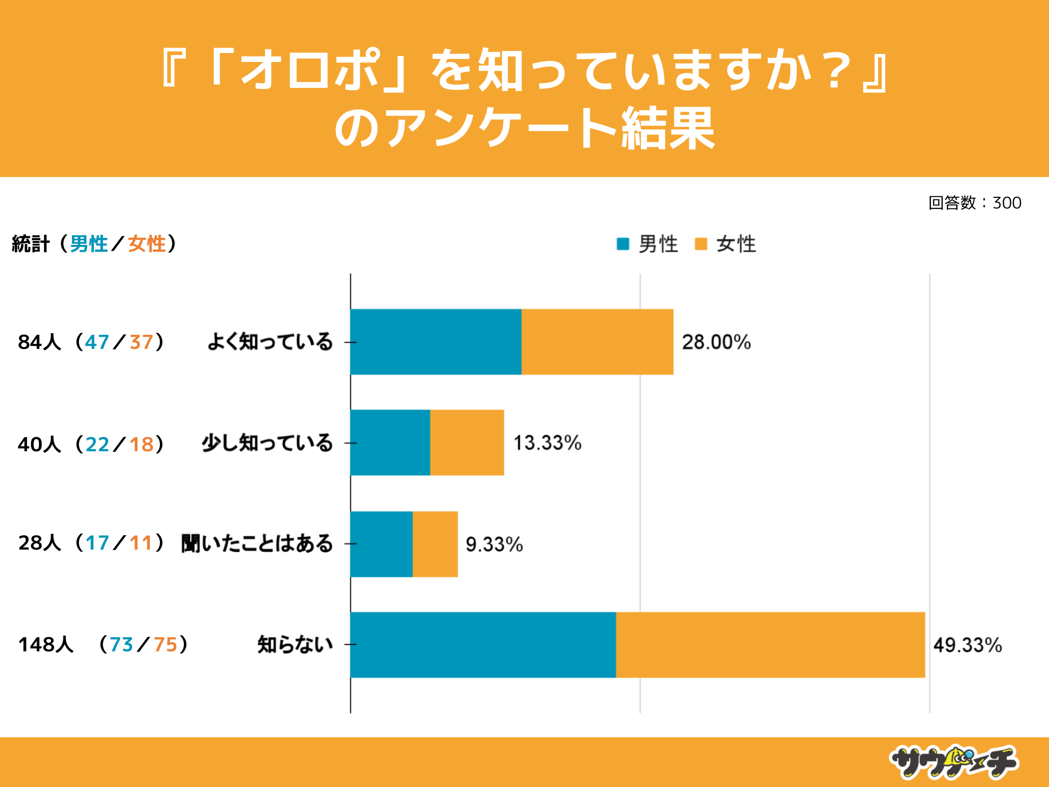 10代〜30代男女を対象とした『「オロポ」を知っていますか?』というアンケートで、最も多かった回答は「知らない」で49.33%でした。