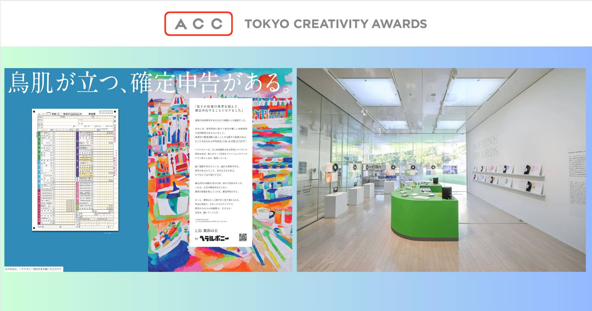 「ACC TOKYO CREATIVITY AWARDS」は、あらゆる領域におけるクリエイティブを対象とした国内最大級のアワードで、さまざまな業界の第一線で活躍するクリエイターや有識者、著名人などの審査委員の厳正な審査を経て、応募総数2,448件の中から、1月31日「異彩(イサイ)の日」に行ったソーシャルアクション「鳥肌が立つ、確定申告がある。」が、PR部門の総務大臣賞/ACCグランプリを受賞。なお、PR部門は昨今の広報PRの重要性から本年度より新設された部門で、計151件の応募作品のうち初代グランプリを受賞しました。デザイン部門では、知的障害のある人々の日常音を「音楽」を通じて社会へ届け、体験者に認識の変化を促す新感覚のサウンドプロジェクト「ROUTINE RECORDS」がACCシルバー受賞となり、計2部門で受賞いたしました。