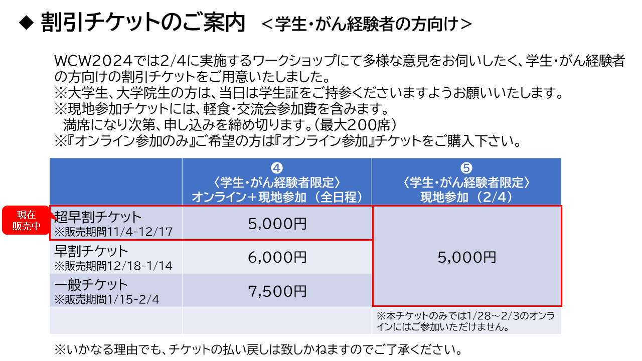 また2月4日に実施するワークショップにて、多様なご意見を伺いたく、学生・がん経験者の方向けの割引チケットをご用意しました。