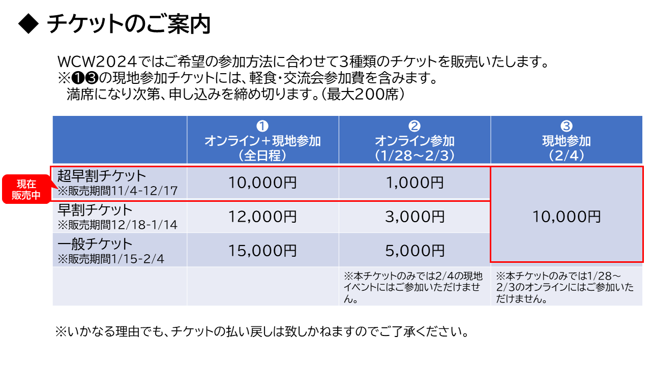 World Cancer Week 2024では、ご希望の参加方法に合わせて3種類のチケットを発売します。