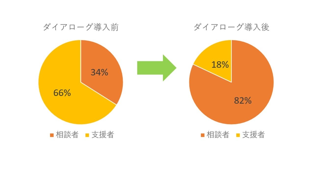 結果を図1、図2に示しました。導入前後の比較において、相談者(事業所利用者の親)の発話量が34%から82%へ増加。支援者の、支援における相談者への関り時に変化を感じられたかについての割合は、10段階評価で7以上が69.2%もいることがわかりました。