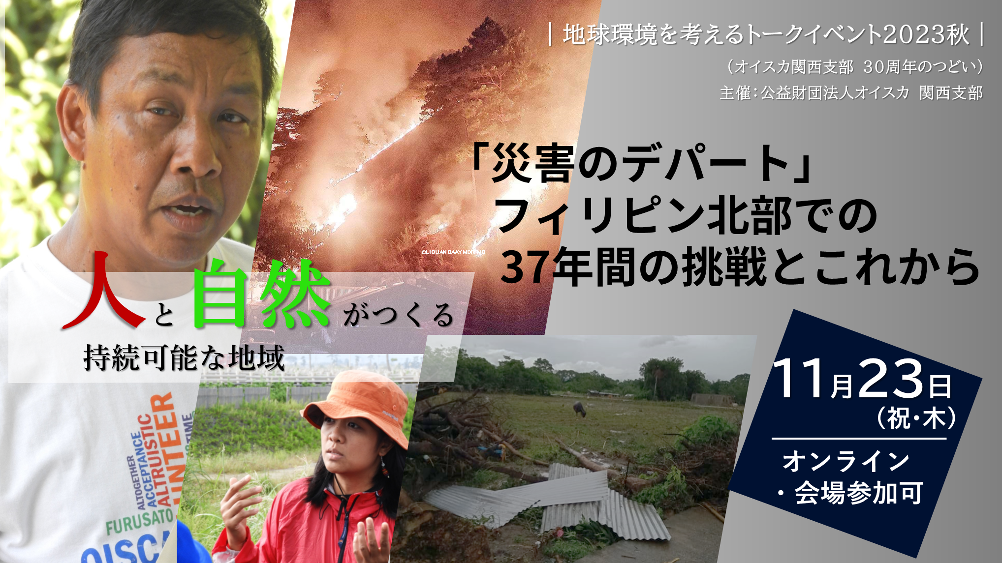 フィリピンは世界有数の災害多発国であり、中でも北部に位置するアブラ州は、洪水や風害、山火事、地震などの被害が深刻な貧困地帯です。本イベントでは、デルフィン・テソロ(アブラ農林業研修センター所長)と、同国に17年駐在し、センターの設立に尽力した清水利春(オイスカ関西研修センター所長)が登壇。アブラ州での活動に焦点を当て、人々の生活の質を少しでも上げたいと長年取り組んできた農村青年への研修や、環境保全活動にかけるデルフィン・テソロの想いとともに、これまでの取り組みと今後の展開について語ります。