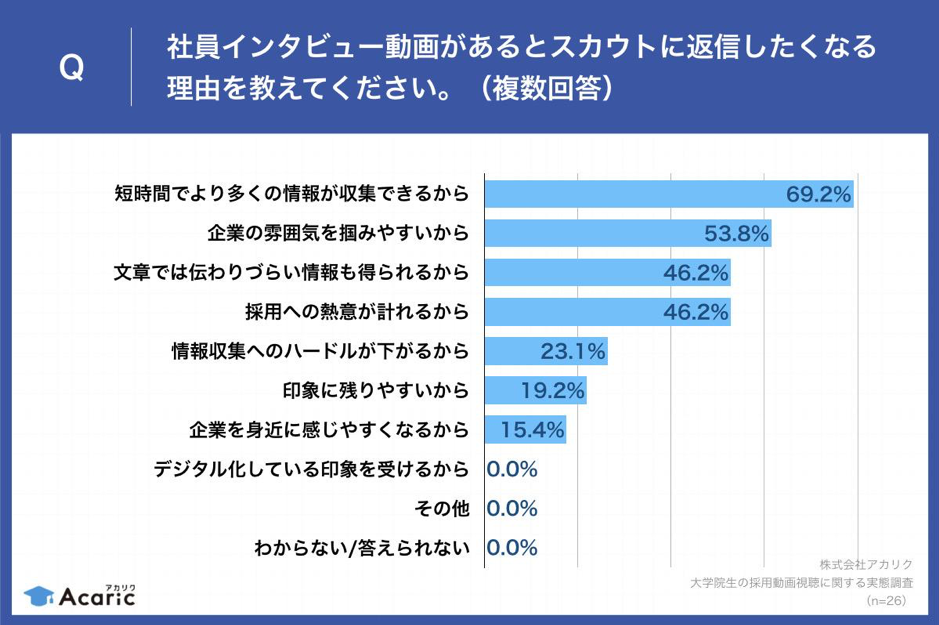 また、知らない企業からスカウトを受けた際に、社員インタビュー動画があった場合、社員インタビュー動画がない場合に比べ、「スカウトに返信したくなる」と回答した大学院生就活生は72.3%にのぼり、その理由として、約7割から「短時間でより多くの情報が収集できるから」、5割強から「企業の雰囲気を掴みやすいから」という声が挙がっています。