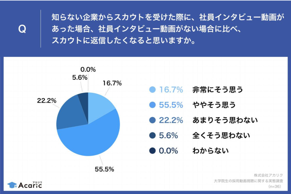 学生が就職活動時に利用しているメディアの中で、YouTube等の「動画から情報を得ている」という比重が高まっているという記事やデータが散見されます。実際に、ダイレクトリクルーティングにおいて、動画リンクを入れた文章にすることで、学生からの反応率が上がる事例も出始めています。アカリクが実施した調査でも、大学院生就活生の約8割が企業選びの際に「社員インタビュー動画」を参考にしている実態が明らかになっています。