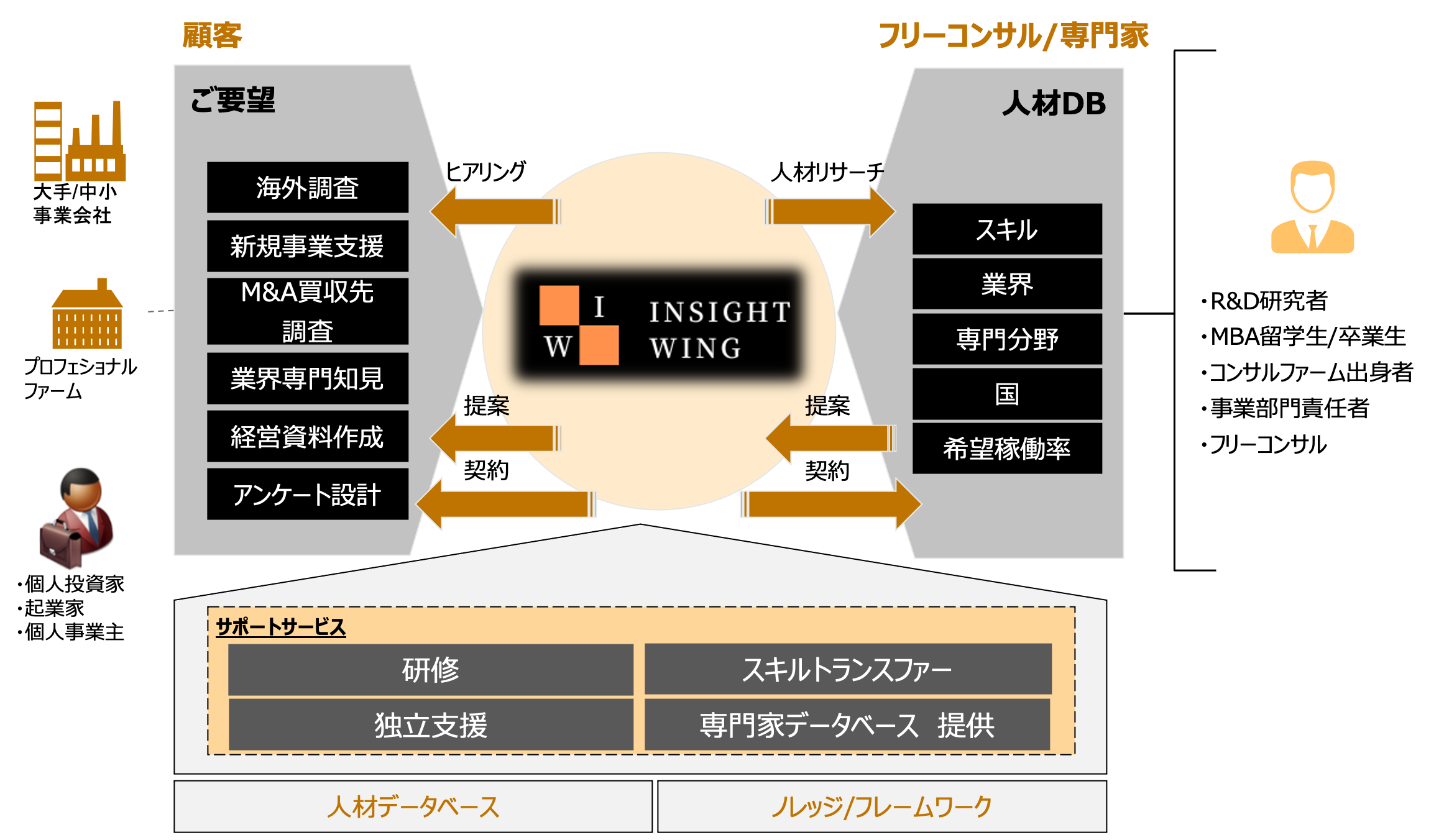 InsightWingは、エキスパートと企業を繋ぐビジネス領域に特化したマッチングサービスです。専門的な分野に特化したエキスパートと、その分野においての知見やノウハウ及び人材を必要とする企業を繋ぎ、ビジネスを加速する各種サービスをご提供してまいります。