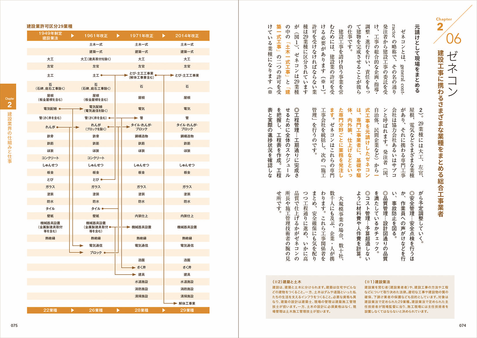建設業界の仕組みや仕事内容、そして最新動向や就活ノウハウを解説した本書。図版や図解を用いて基礎から解説しているので、建設業界の入門書として最適です。また現場で活躍する若手のインタビュー記事を多数収録しており、仕事のやりがいやおもしろ味といった深いところまでわかる内容となっています。さらに気候変動、人口減少といったさまざまな課題に直面し、変革を迫られている建設業界の現状と未来を描くことを目指して編集されており、建設業界の第一線で活躍している人にとっても役立つ内容となっています。
