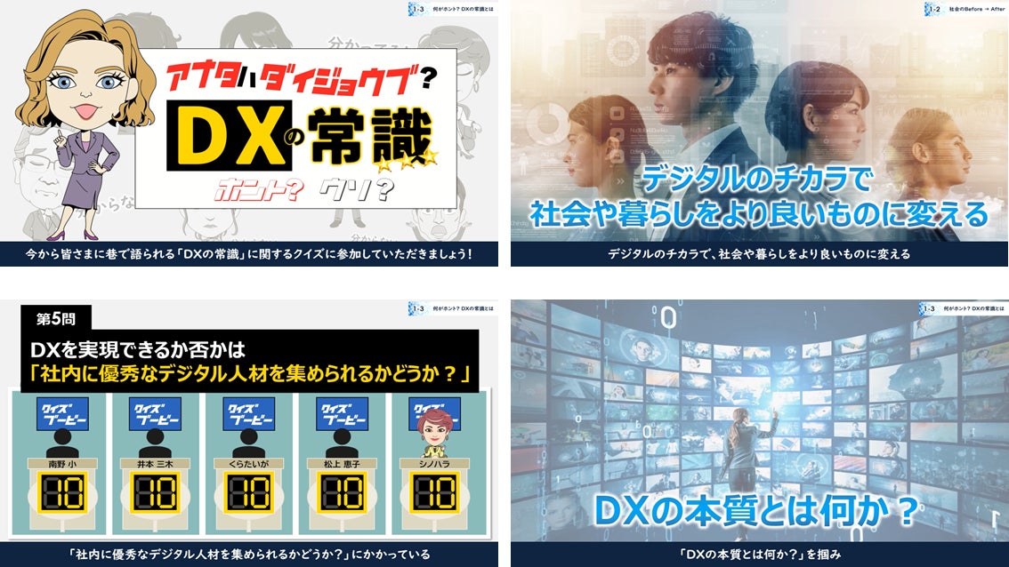DXの本質と全体像をリアルにつかめる全社員向けeラーニングです。まだDXについてあまり理解していない社員の学習への動機づけに活用いただけます。ポップで印象的なアニメーションを用い、デジタルに苦手意識のある社員の取組みやすいのが特徴です。インプットだけでなく、各章で「自分の立場に置き換えるなら」というアンケートに回答してもらうことで、理解度促進と行動変容を促す設計となっています。