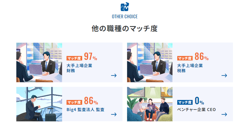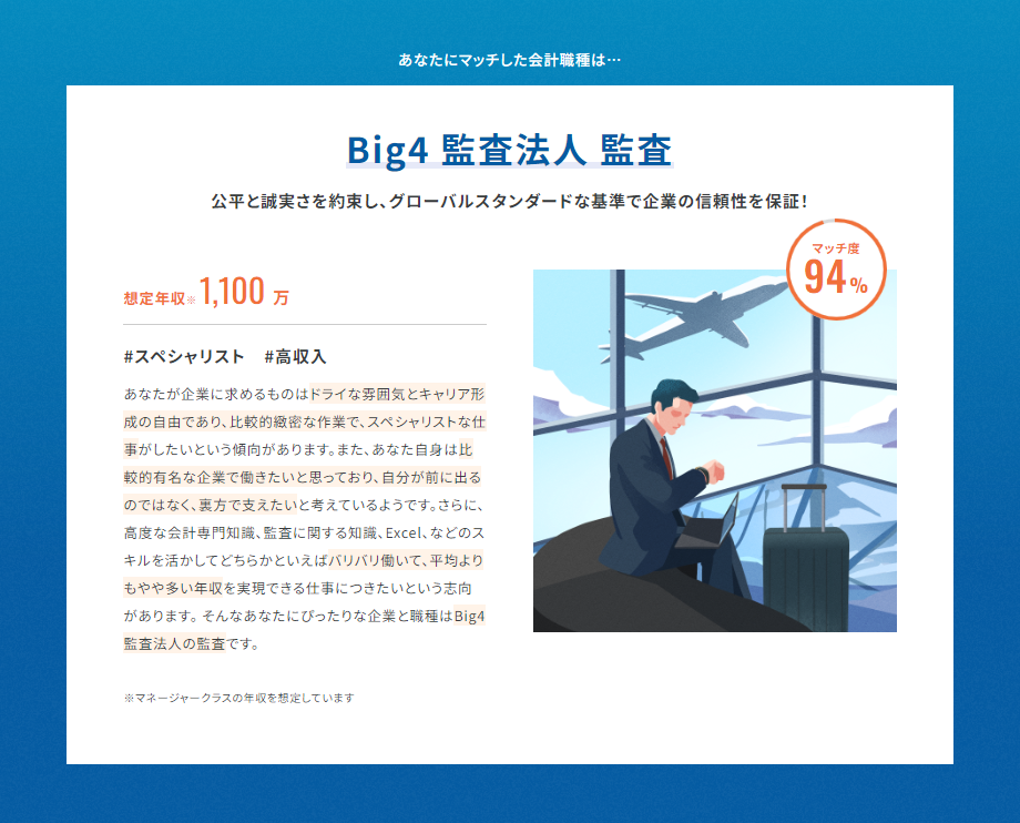 また本サービスは、先日webサイト版もオープンした会計人材のキャリア・ロードマップを網羅する「会計人材のキャリア名鑑」との連動コンテンツとなっております。そのため、診断結果の判定だけでなく、その職種について詳細に知りたい方は、「会計人材のキャリア名鑑」で想定年収や必要なスキル、キャリアパスなどを知ることもできます。