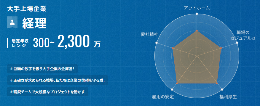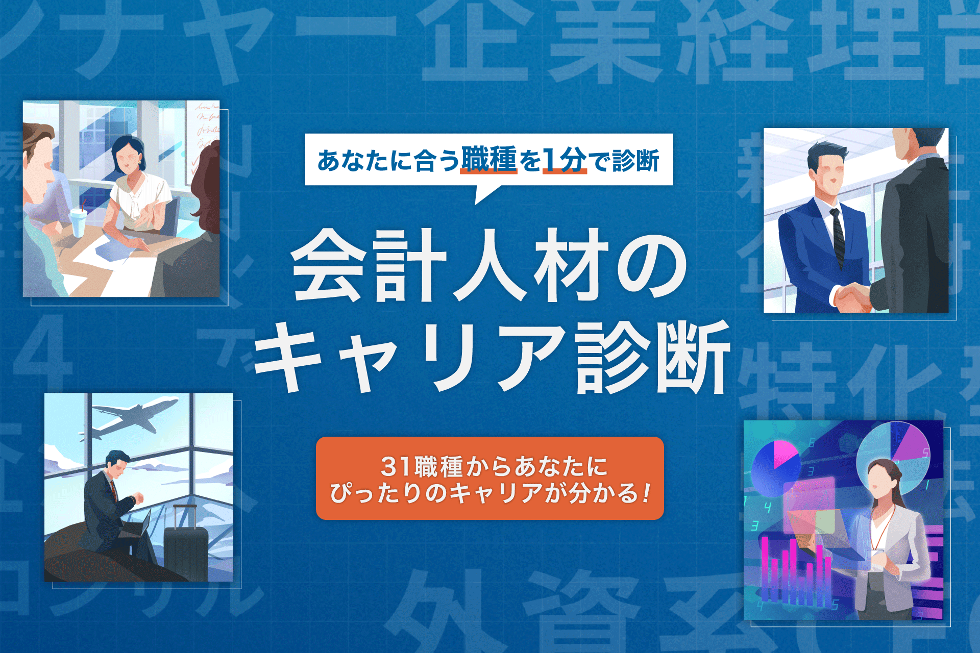 経理、財務、税務、経営企画、内部監査など、部署ごとの業務をはじめ、コンサル、監査法人、税理士法人など、会計人材が従事する31職種よりあなたに合う会計職種を診断します。数多くの会計職種を網羅した、会計人材専用の適職診断サービスです。