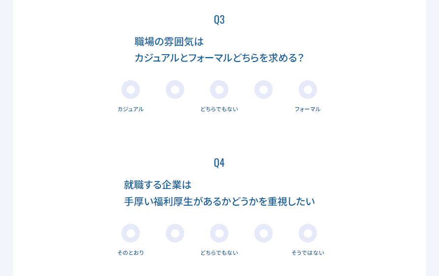 スキル、希望する働き方、性格など21軸のパラメータにより、あなたの志向を分析。マッチ度の高い職種を判定します。