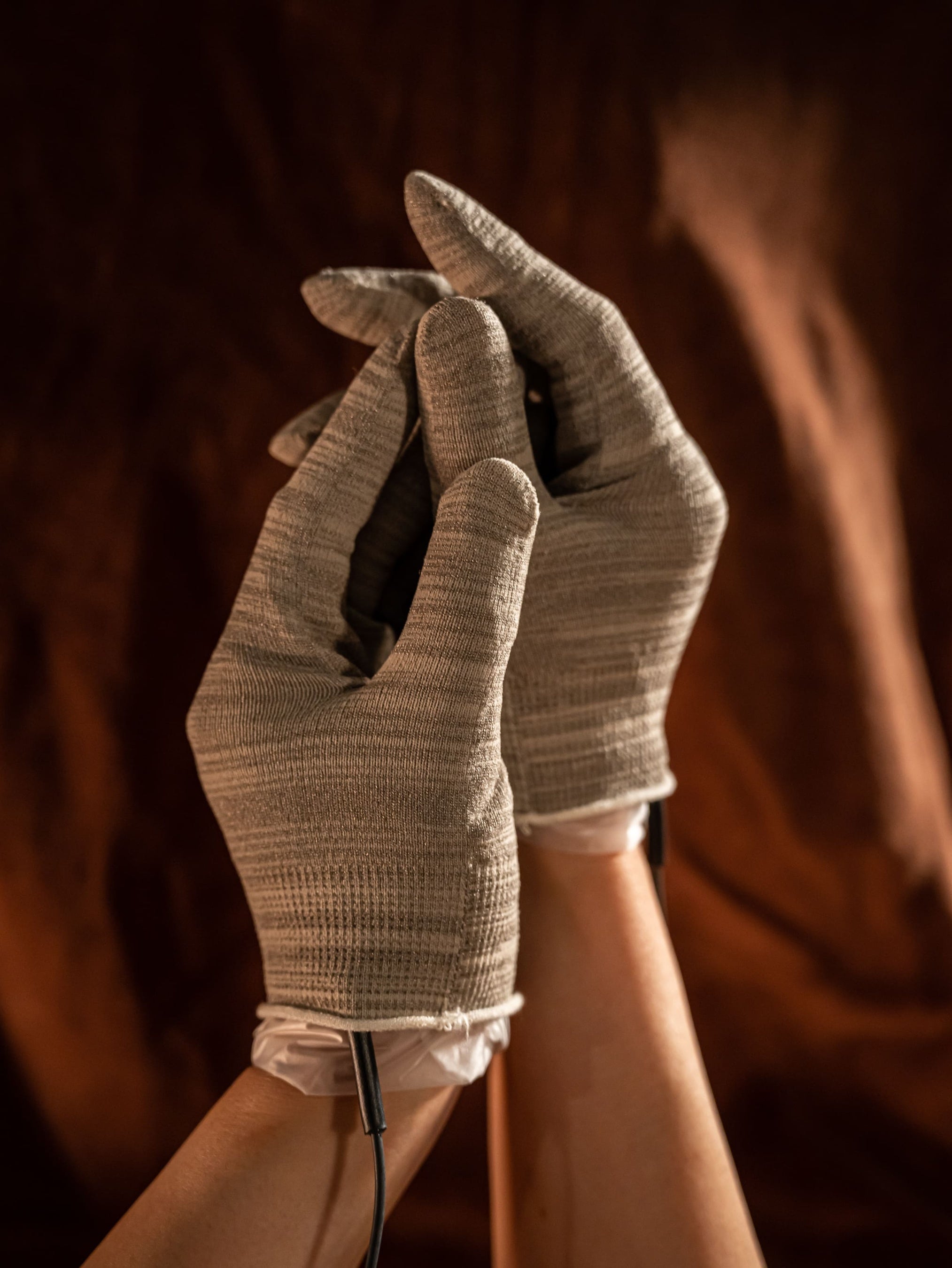 主な目的は、標的筋束のIb抑制反射や腺分泌などの生体反応を誘導することにあります。この装置は、微弱な電流を使ったEMS(電気筋肉刺激)とは異なり、的確に標的を刺激し、柔軟かつ繊細な手袋型の電極を使用することで、生体反応を感知しやすくしています。