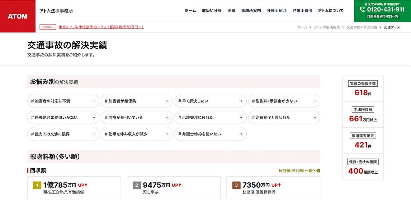 たとえば交通事故の解決実績では、症状・お悩み・年代・職業など、充実した情報を掲載。自分に近い解決事例がきっと見つかります!
