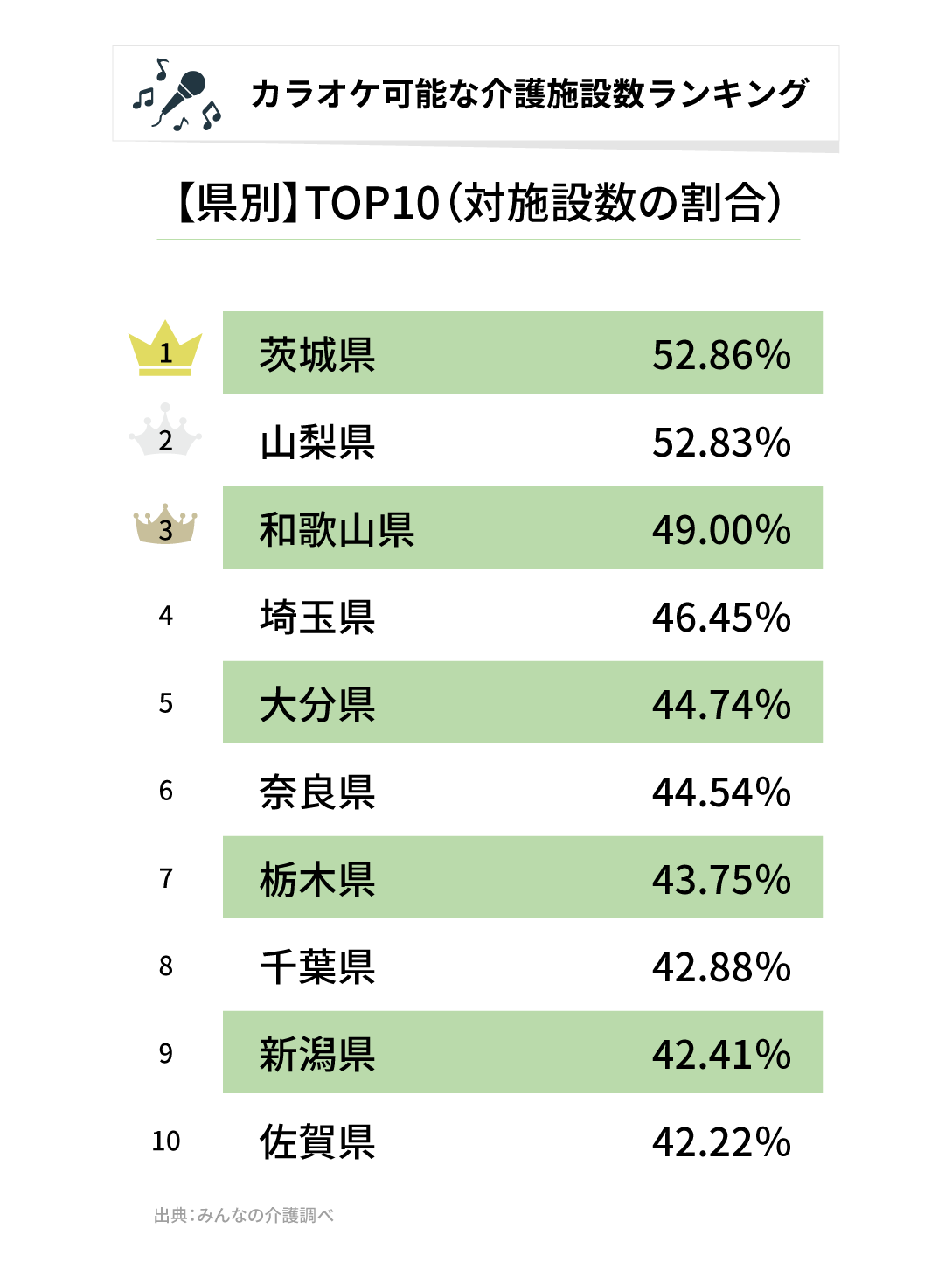 カラオケ可能な介護施設数の割合の1位は茨城県