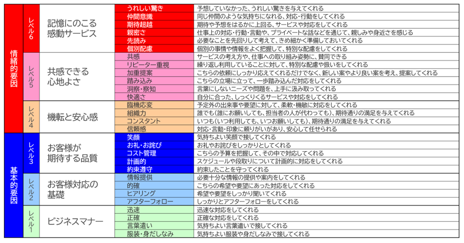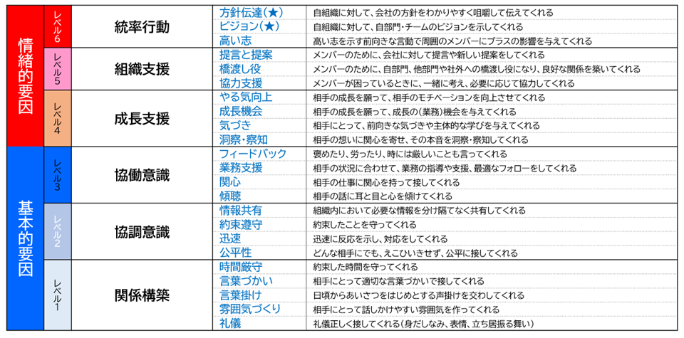 基本的要因(レベル1~3)はコミュニケーションにおける礎となる要因で、周囲と円滑な人間関係を築く「関係構築」ができているか、他者と協力・調和し合う「協調意識」や互いを尊重しながら協力して働く「協働意識」があるか、基礎となる要因を体系化しています。情緒的要因(レベル4~6)では、相手の成長を促すために気付きや学びを提供する「成長支援」、組織の成果を最大化させるための「組織支援」ができているか、さらには周囲を巻き込み、正しい方向へ導く「統率行動」といった、相手が感じる価値が期待を超えホスピタリティレベルの評価につながる要因を体系化しました。