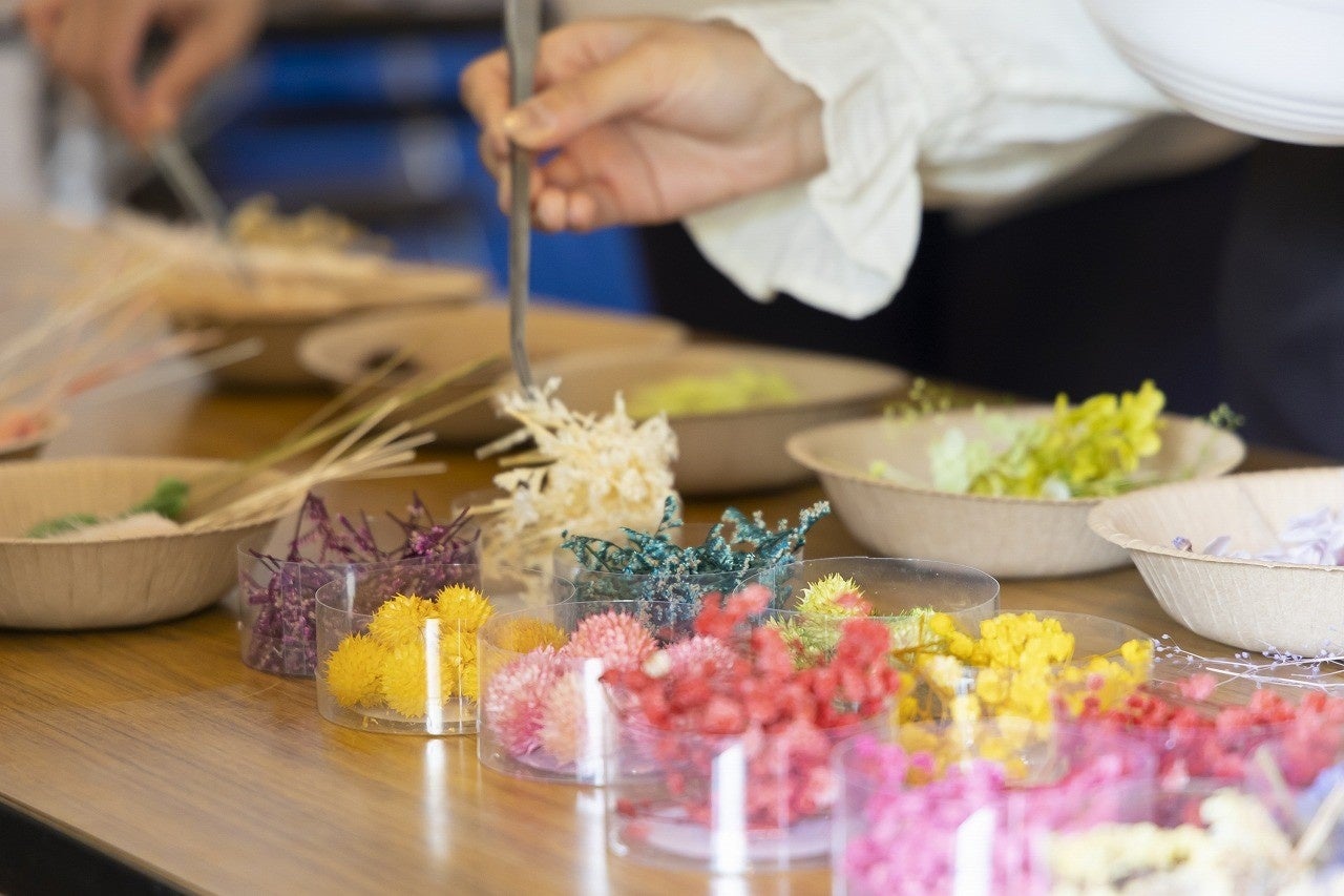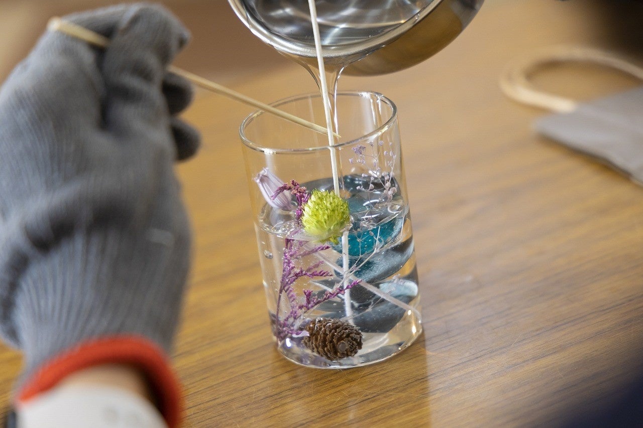 色とりどりのドライフラワーや花公園内の紅葉、木の実などの植物を使って、秋のオリジナルキャンドル作りを体験。