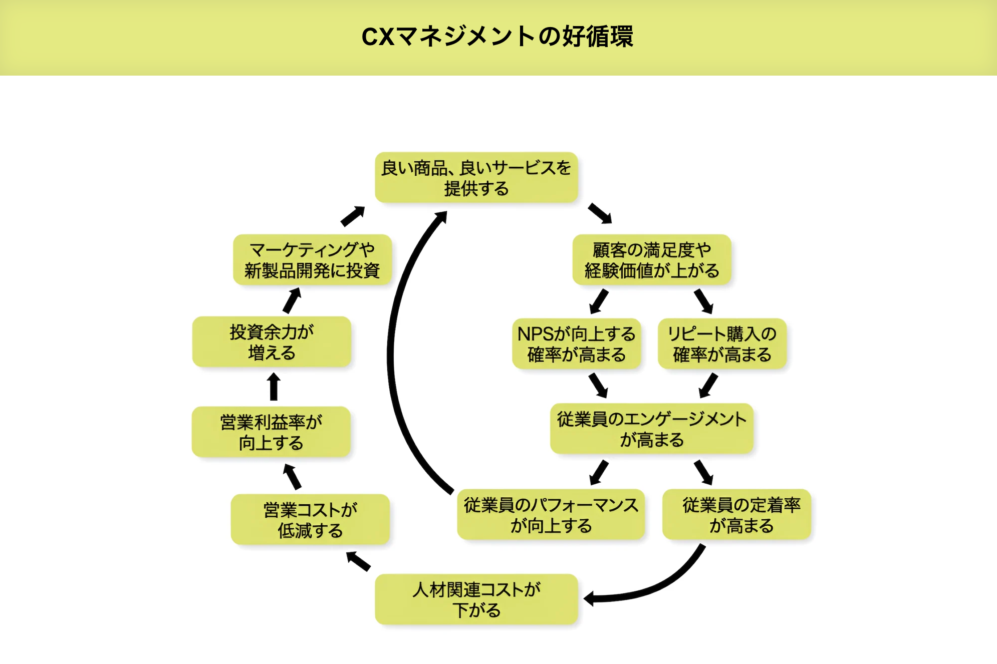 CXの評価指標である、顧客ロイヤルティを数値化するNPS(Net Promoter Score)は、事業成長や収益性と相関があるとされていますが、その背後に働く経済循環法則は、次のように考えられます。良い商品やサービスの提供は、顧客の満足度や経験価値を高め、リピート購入やNPSの向上につながります。その結果、従業員のエンゲージメントが高まり、パフォーマンスも向上します。それは、さらに良い商品、良いサービスの提供につながります。また、従業員のエンゲージメントが高まると、従業員の離職率の低下、言い換えれば定着率の向上へと結びつき、人材関連コストが下がります。こうして営業コストが低減し、営業利益率が高まり、投資余力が増え、継続的改善や新商品開発に投資できる、という好循環が形成されます。