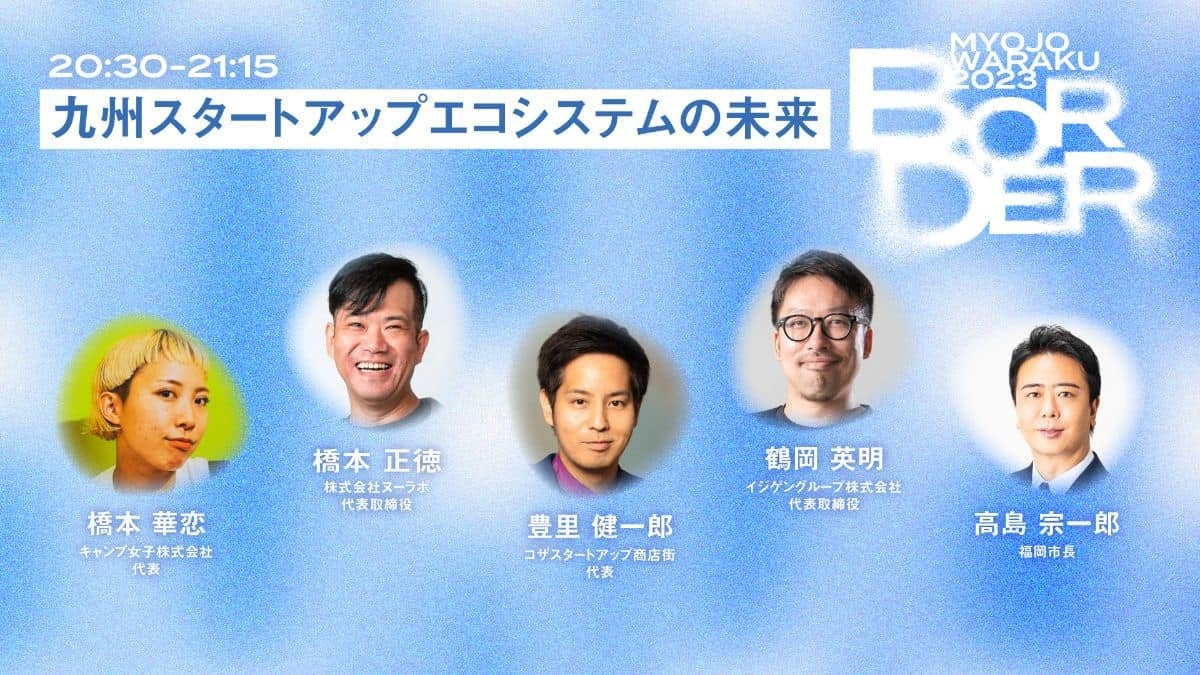 明星和楽2023では、福岡市長 高島宗一郎氏、株式会社ヌーラボ 代表取締役 橋本正徳氏、コザスタートアップ商店街 代表 豊里健一郎、イジゲングループ株式会社 代表取締役 鶴岡英明氏と共にパネルディスカッションを行い、九州スタートアップのエコシステムや、スタートアップで重要なコミュニティ作りについて、また、そのコミュニティーを率いるリーダーについてなど、熱い議論をかわしました。