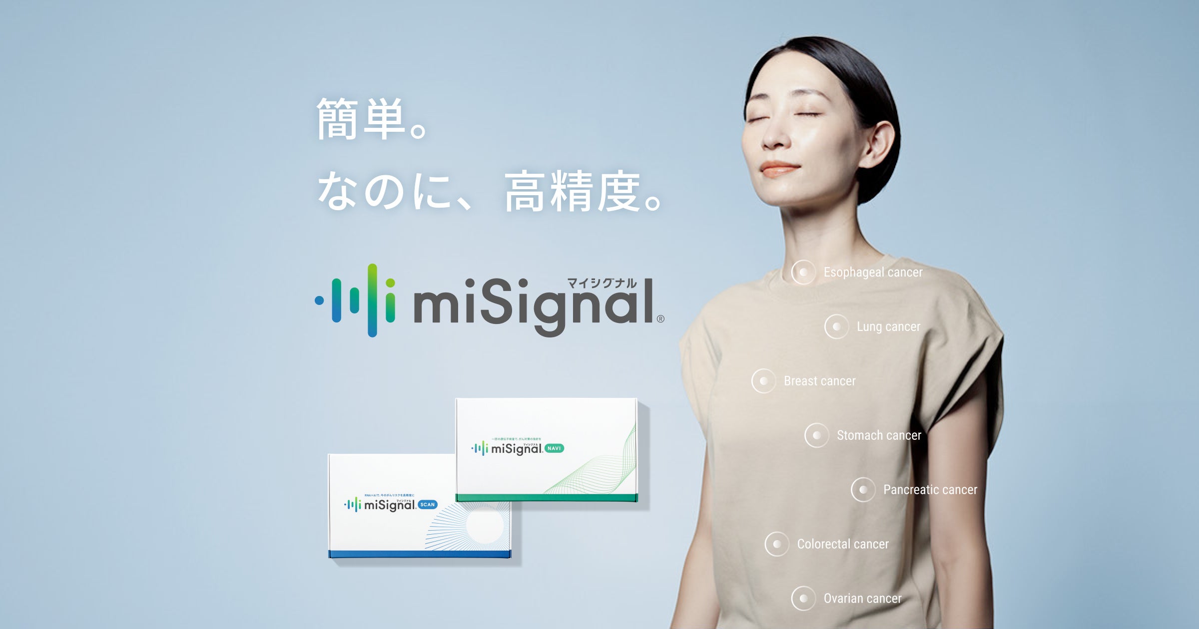 マイシグナル®︎シリーズは、RNA×AIで今のがんリスクを高精度に評価できる「マイシグナル・スキャン」と、一回の遺伝子検査でがん対策の指針を示す「マイシグナル・ナビ」で構成されています。本サービスでは、尿やだ液を採取するだけで、体に負担なく総合的ながん対策が可能です。まず自分の持って生まれた遺伝的リスク・生活習慣や環境リスクを「知る」ところから支援し、がんに対する正しい知識をもとに個々人のリスクに応じた予防のための行動変容を促すことで、がんを効果的に予防する取り組みをサポートします。そして、がんの「早期発見」をサポートすることで、生存率の上昇に貢献することを目指します。現在の対応がん種は、すい臓がん、大腸がん、胃がん、食道がん、肺がん、乳がん、卵巣がんの7種です。詳細はWebサイト(http://misignal.jp/)をご覧ください。