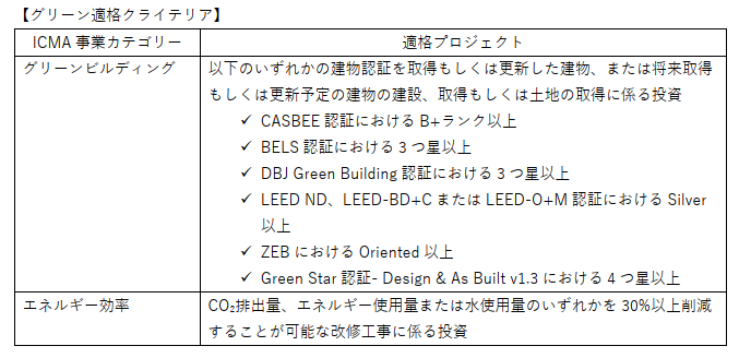 グリーンファイナンスで調達された資金は、新規投資または既存投資(リファイナンス)に充当を予定しており、以下に定める適格クライテリアを満たすプロジェクトに充当する予定です。