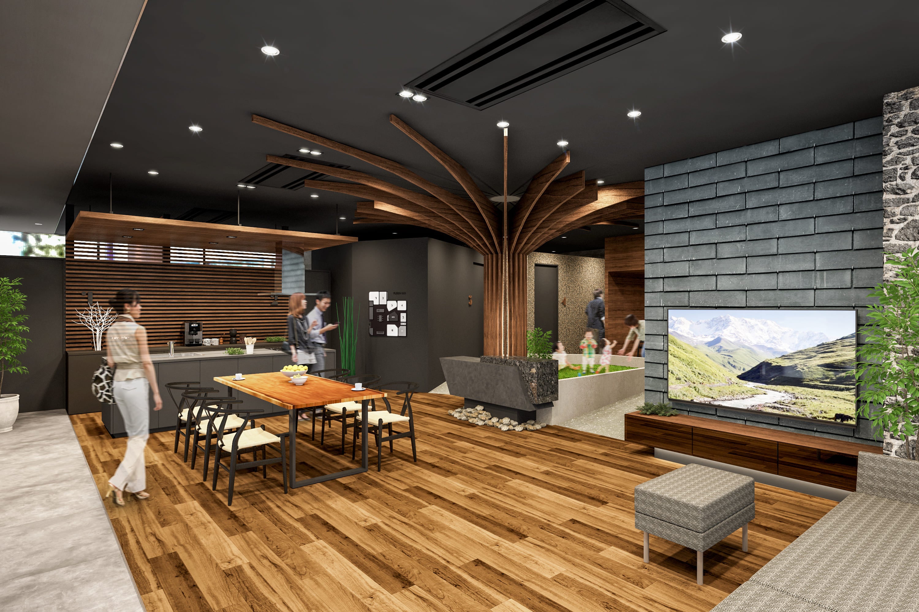 また、大樹の下にはお子様を預かるキッズスペースを完備しており、打合せに集中することができる空間を創出。