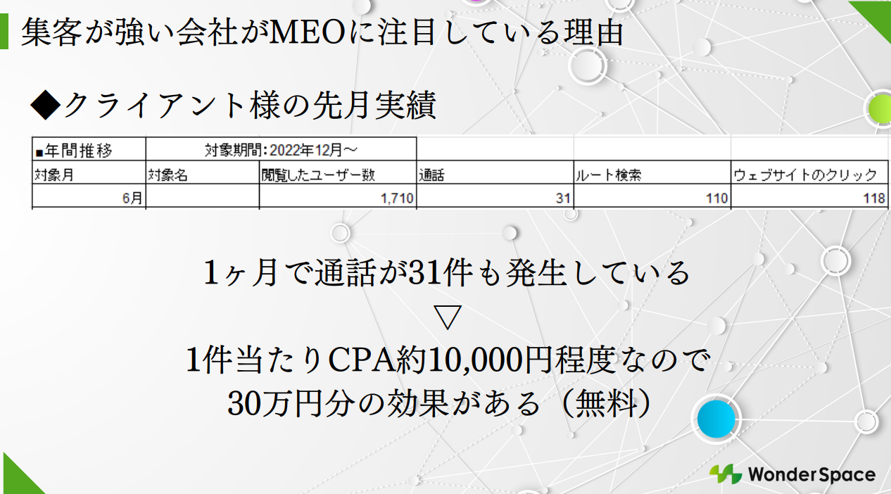 MEOの知名度の低さもあり、対策に着手できている事業者様も少なく、大きな機会損失になっている可能性があります。弊社クライアント様では、実際にGoogleマップから無料で月間30件のお問い合わせを獲得できた事例があります。