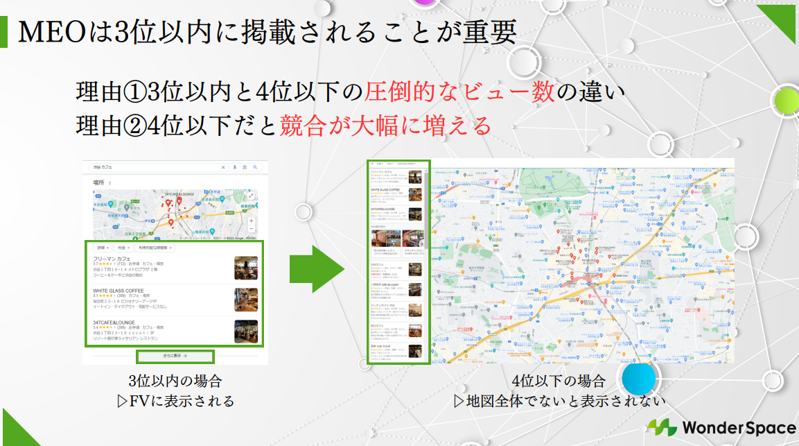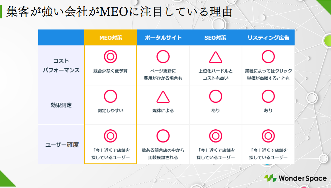 MEO対策は他のWEB集客方法に比べて比較的新しい方法であるため、競合が少なく、上位表示させることで集客の向上に繋げることができます。さらに検索ユーザーは通常、自身の地域に近い店舗を探す傾向があるため、地域密着型のビジネスとMEOは相性がとても良いです。