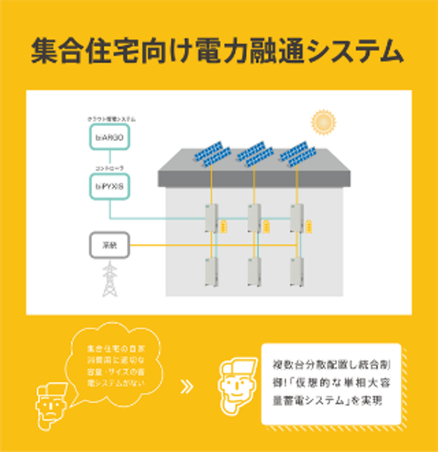 太陽光パネルと住宅用ハイブリッド蓄電システム「Mapple GX Battery」複数台を分散配置し統合制御をすることで「仮想的な単相大容量蓄電システム」を実現します。