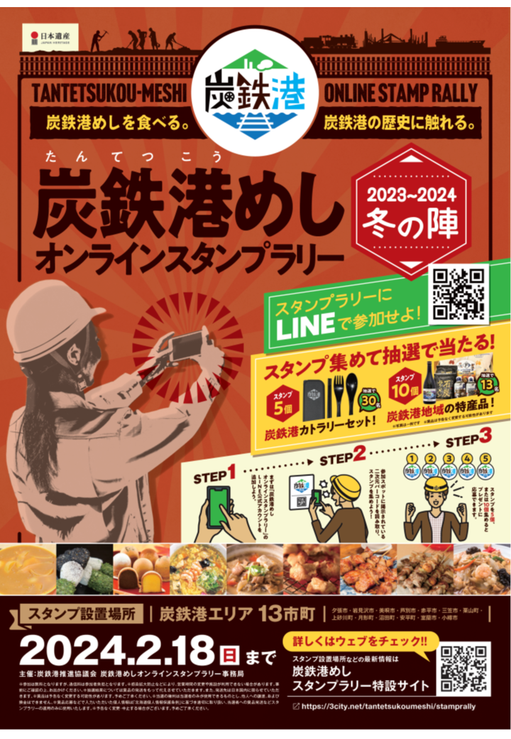 炭鉄港推進協議会では、日本遺産「炭鉄港(たんてつこう)」の食文化である「炭鉄港めし」の認知度向上、地域への定着、地域周遊を目的として、「炭鉄港めしスタンプラリー」を開催します。