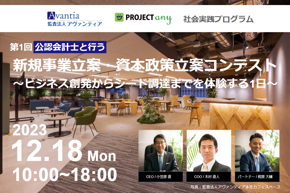 起業家・起業を志すプロジェクト・エニー所属の20代 (以下「エニー生」) と公認会計士 (模擬CFO) が協力し、新規事業立案を行うビジネスコンテスト。監査法人アヴァンティアとプロジェクト・エニーが共同企画した、エニー生だけが参加できるオリジナル企画です。