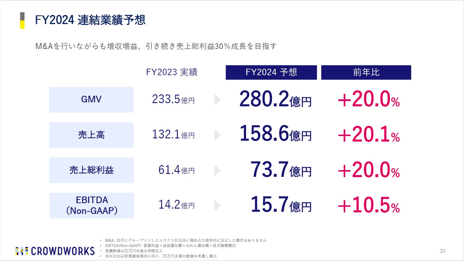 中長期目標である「売上総利益のCAGR20%以上成長10年継続」の達成に向け、2024年9月期業績予想は、売上高158.6億円(前期比 +20.1%)、売上総利益73.7億円(前期比 +20.0%)、EBITDA(Non-GAAP)15.7億円(前期比 +10.5%)を目指します。