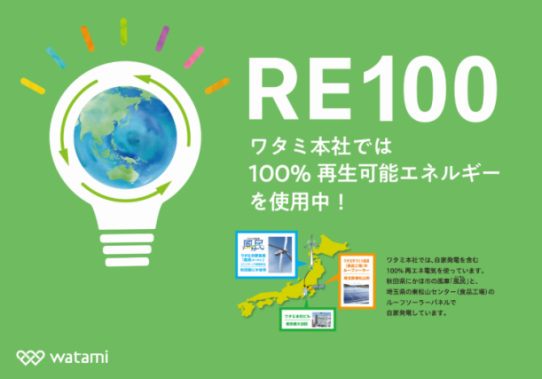 現在、ワタミグループ内においては、ワタミグループ本社、「三代目鳥メロ」笹塚店、「bb.qオリーブチキンカフェ」大鳥居店、「新総合居酒屋 和民のこだわりのれん街」大井町東口店、「ワタミ手づくり厨房」中京センターに、「実質再エネ100%使用の電気」が供給されています。