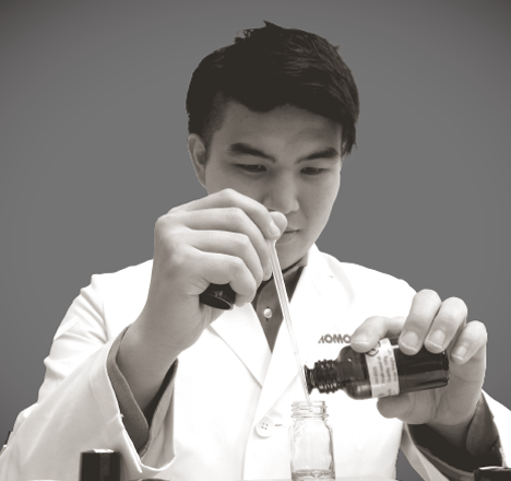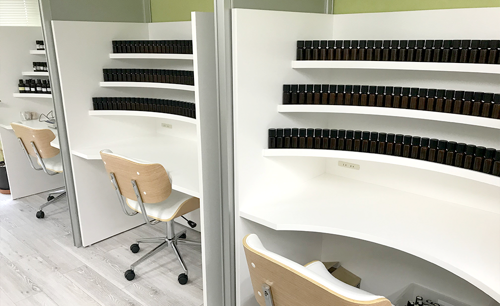 受付正面のガラス越しに見えるオープン調香室は、真っ白で真新しいオルガンタイプの調香台が4台設置されており、当社の専属熟練調香師がお客様にカウンセリングしながら、お客様の好みに応じて様々な単品香料を組み合わせ、ブレンドして自分だけの「オリジナルアロマ」や「私の香水」を作り上げることができる空間となっています。アロマデザイン経験のないお客様でも、自分だけの香りを創る面白さや奥深さを身近に感じていただける日本最大級のオープン調香室です。