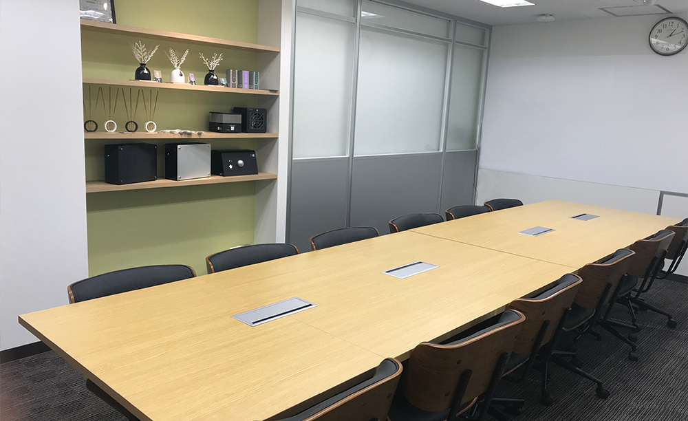 新オフィスの受付に入ってまずお迎えするのは、当社が誇る熟練調香師 渡辺武志が創った当社独自の「オリジナルアロマ」であり当社の‶コーポレートセント″でもある‶メモリー″です。エレベーターを降り、受付ロビーに入った瞬間に、そのほのかな何とも言えない香りがお客様をお迎えし、お客様の心を和らげ緊張感を解きほぐすだけでなく、これから進むであろう商談への期待感を膨らませてくれます。