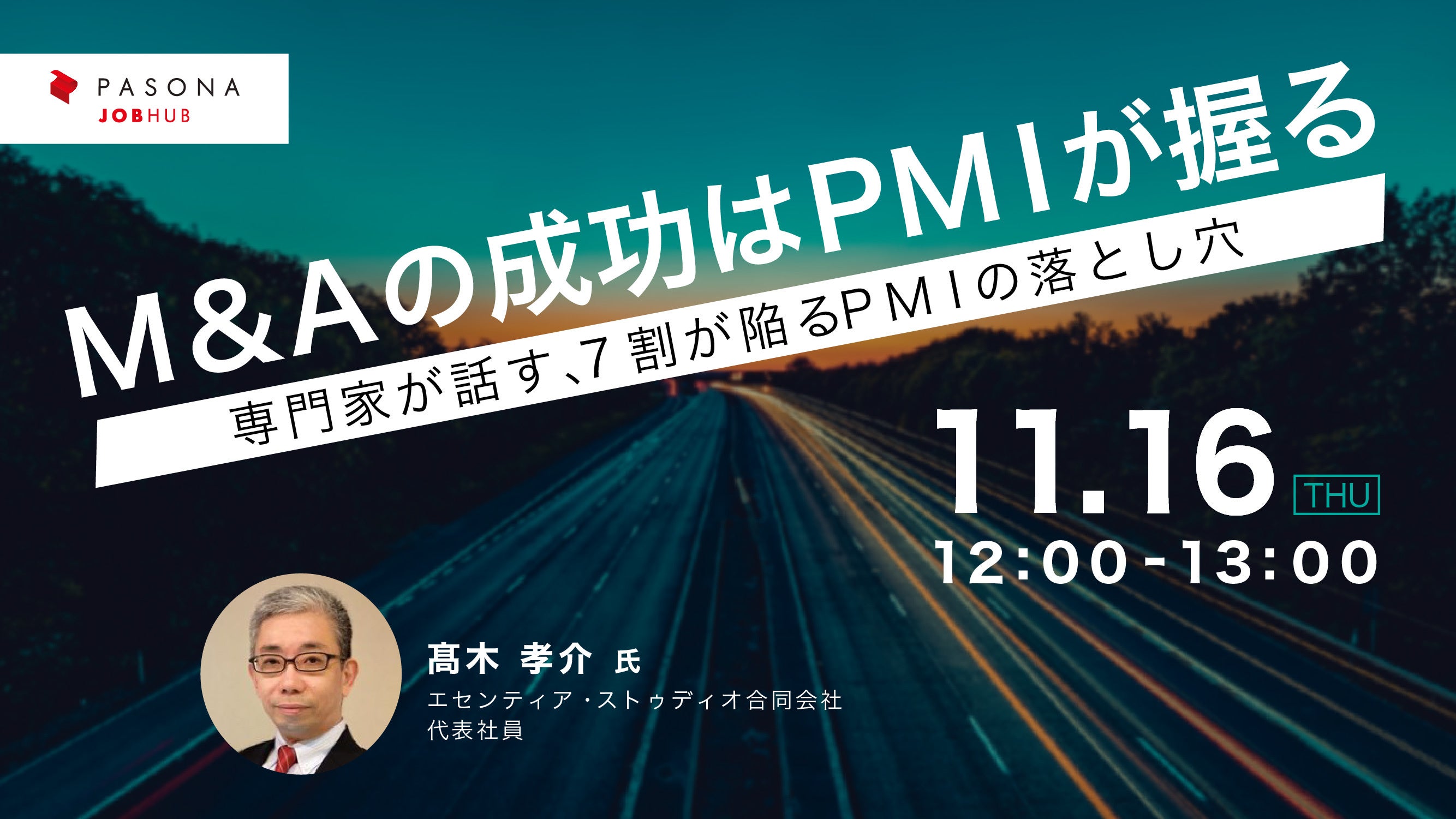 そこで本ウェビナーでは、約30年間にわたり銀行、外資系コンサルティング会社、ベンチャー企業、国内投資ファンド会社等で、財務アドバイザーやコンサルタント、投資責任者として活躍し、M&Aの検討段階からクロージングまでのあらゆる支援実績を有する、髙木孝介氏が登壇。M&Aを成功に導く鍵となる、統合効果を最大化させるための統合作業「PMI(Post Merger Integration)」の準備方法や実施時のポイントについて、これまでの成功事例やご自身の支援経験と共にお話しいただきます。