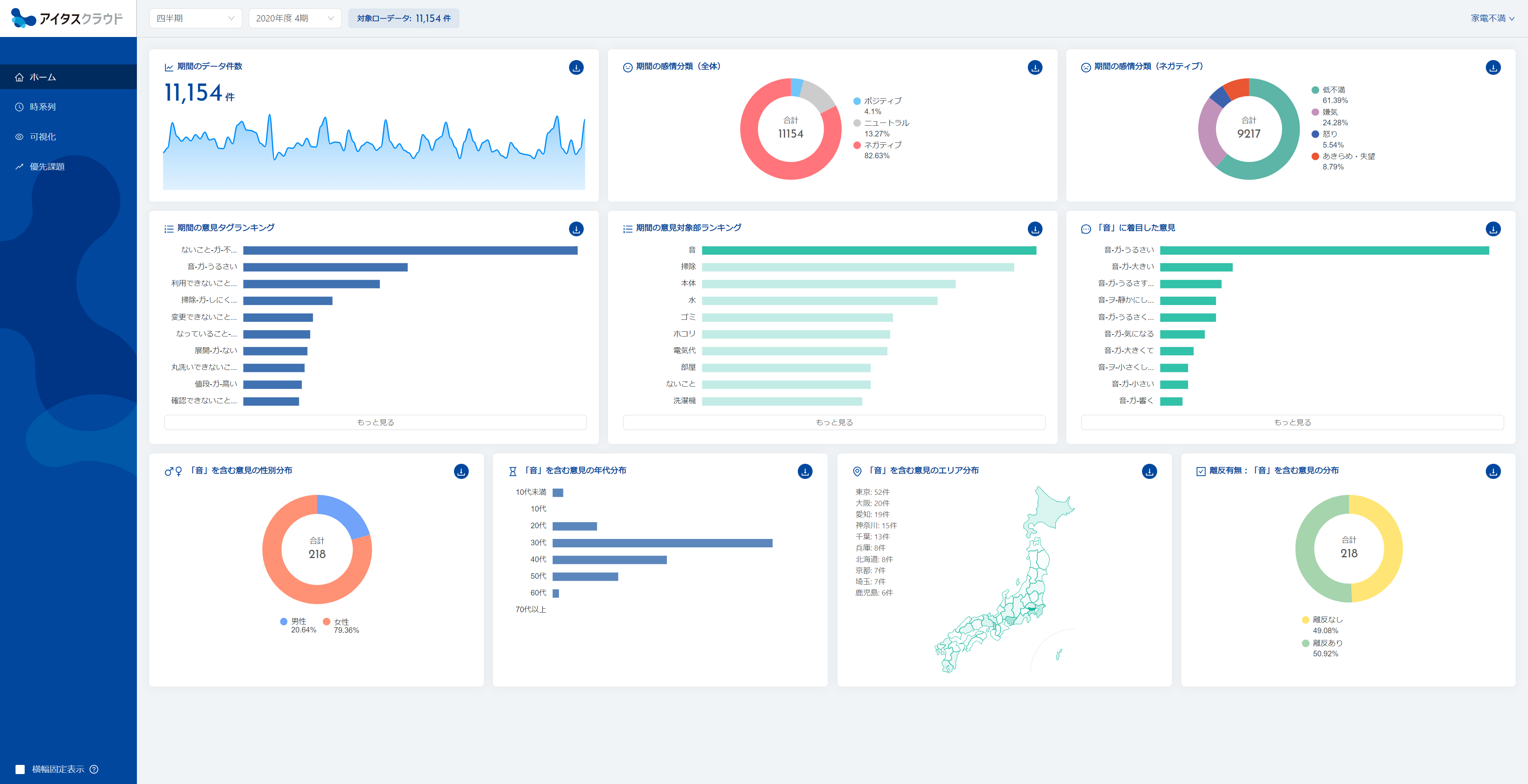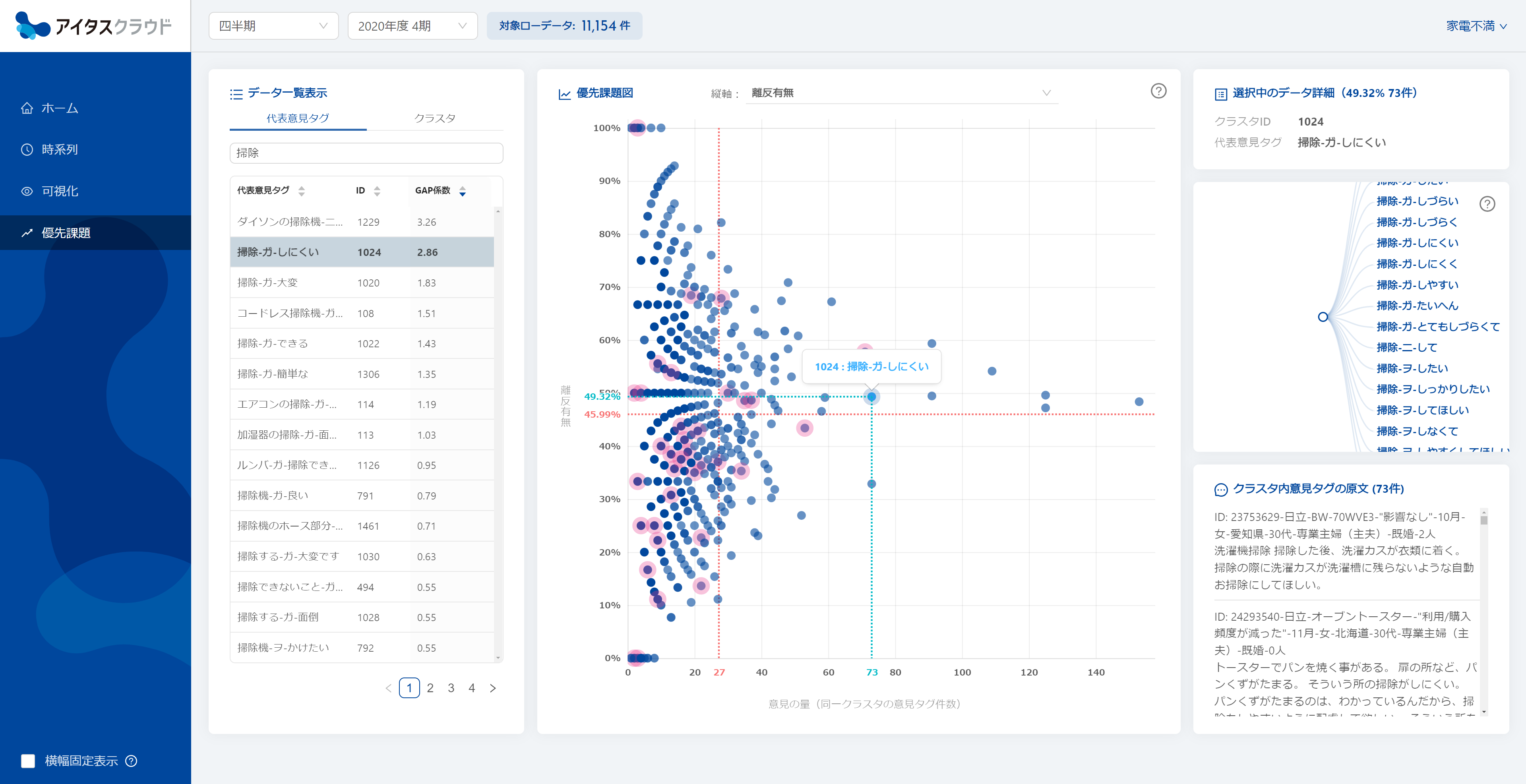 「アイタスクラウド」は最先端の自然言語処理技術を用いた文章解析AI「アイタス」をエンジンとするデータ解析ダッシュボードであり、VOCを可視化するだけでなく、独自のフレームワークにより優先課題を明らかにすることで課題解決のヒントを見つけ、打ち手に繋げることができる業務支援ツールです。