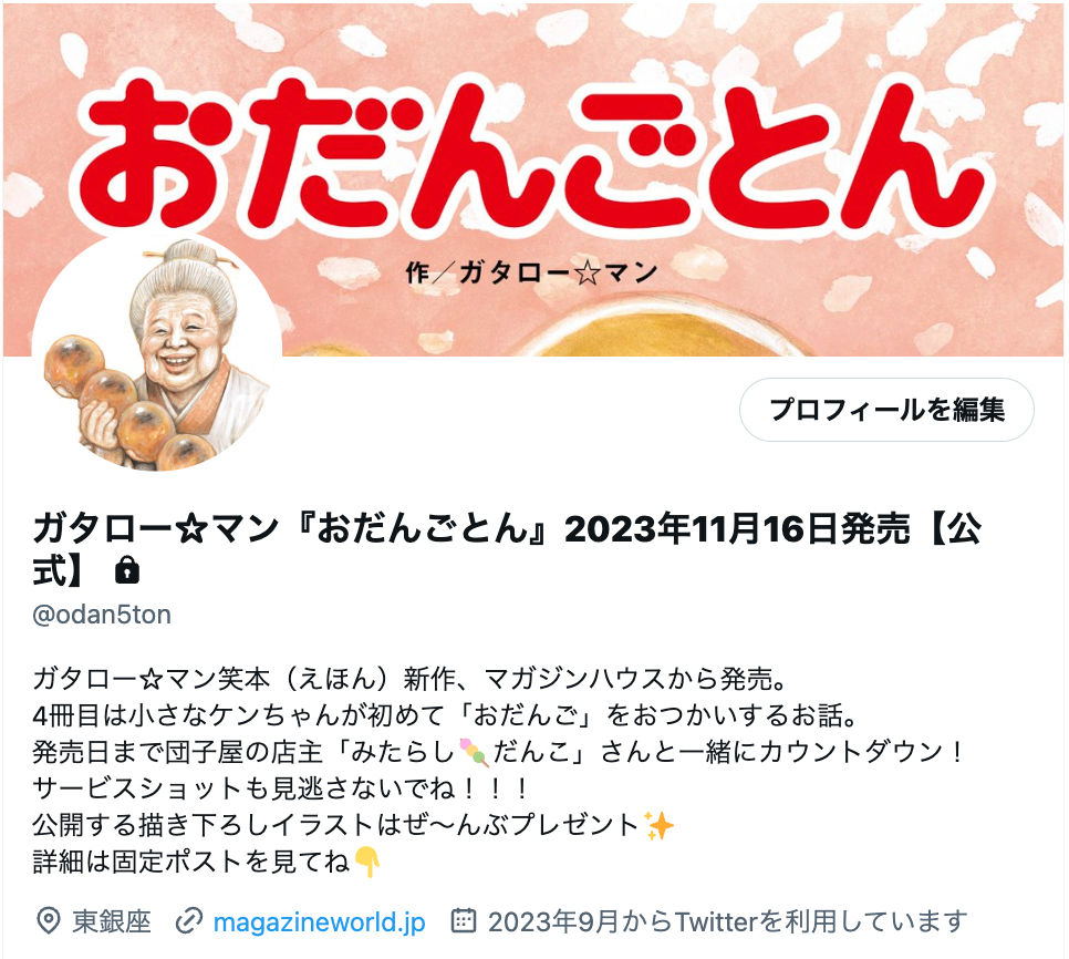 作中に登場するお団子屋の店主のおばあちゃん「御手洗団子(みたらしだんこ)」と一緒に『おだんごとん』発売日までカウントダウンを行う公式X(旧Twitter)アカウントを開設!