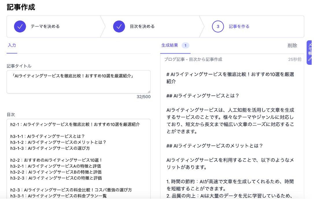 ChatGPT3.5/4.0の技術を活用し、”1分”で記事が作成できる AI文章作成ツールになっています。