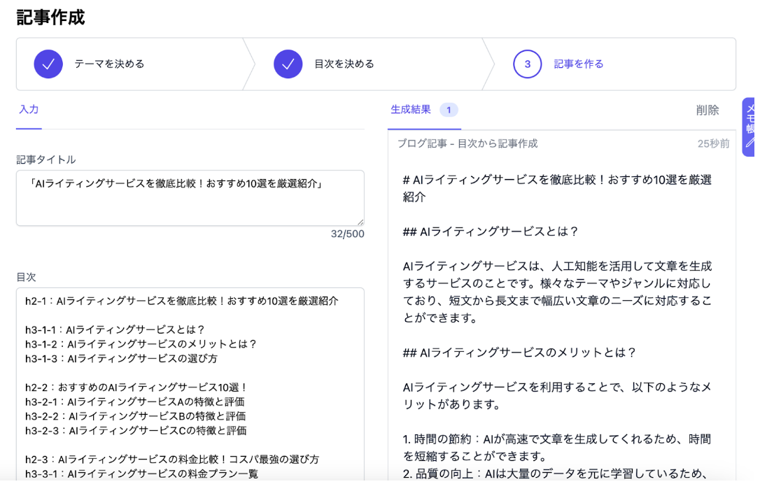 ChatGPT3.5/4.0の技術を活用し、”1分”で記事が作成できる AI文章作成ツールになっています。
