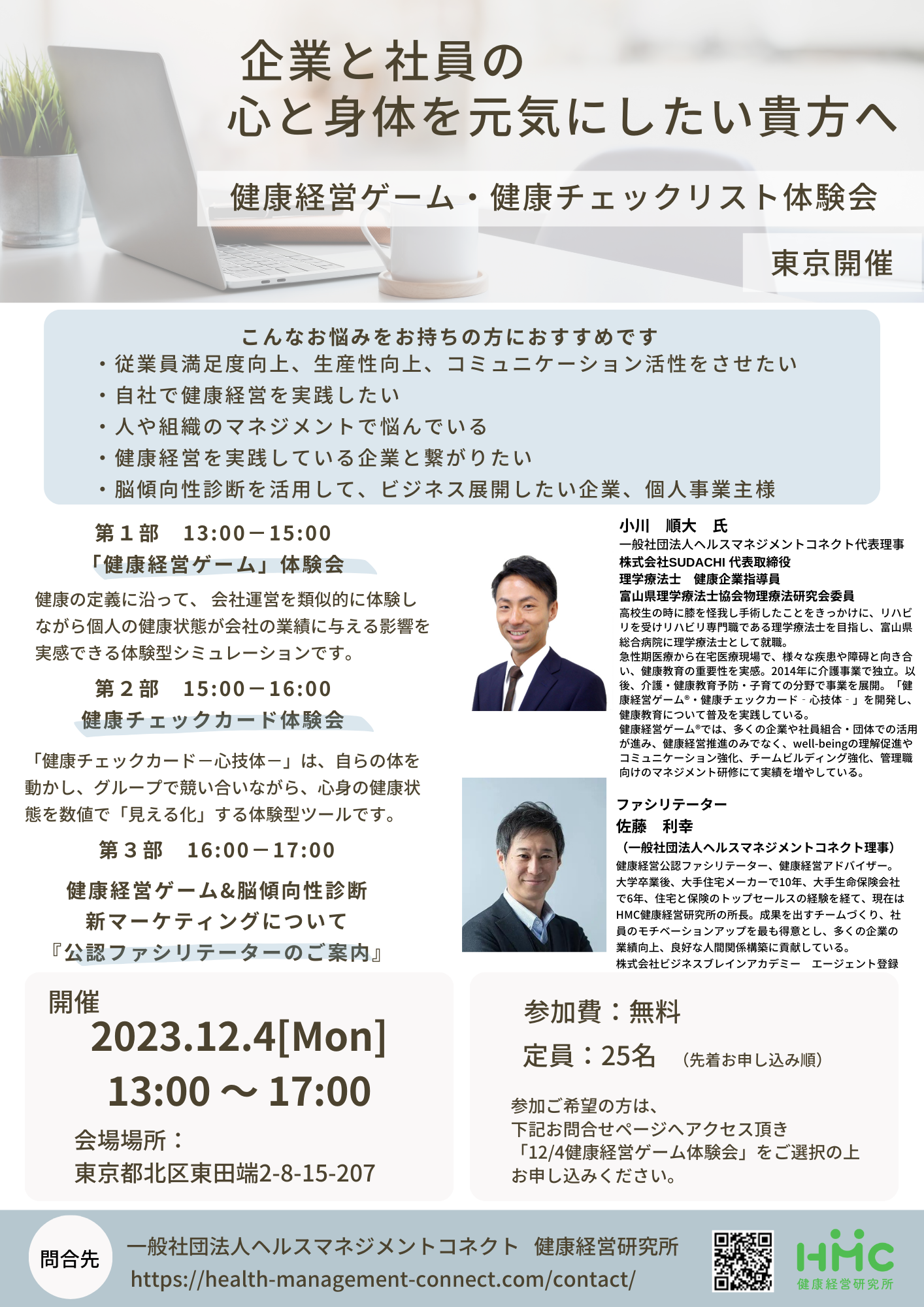 2023年12月4日、東京にて健康経営ゲームと健康チェックカードの体験会を開催いたします。従業員の満足度やパフォーマンスを向上したい、健康経営を実践したい、マネジメントで悩んでいる、脳傾向性診断を活用してみたい、という方はぜひこの機会にご参加ください。