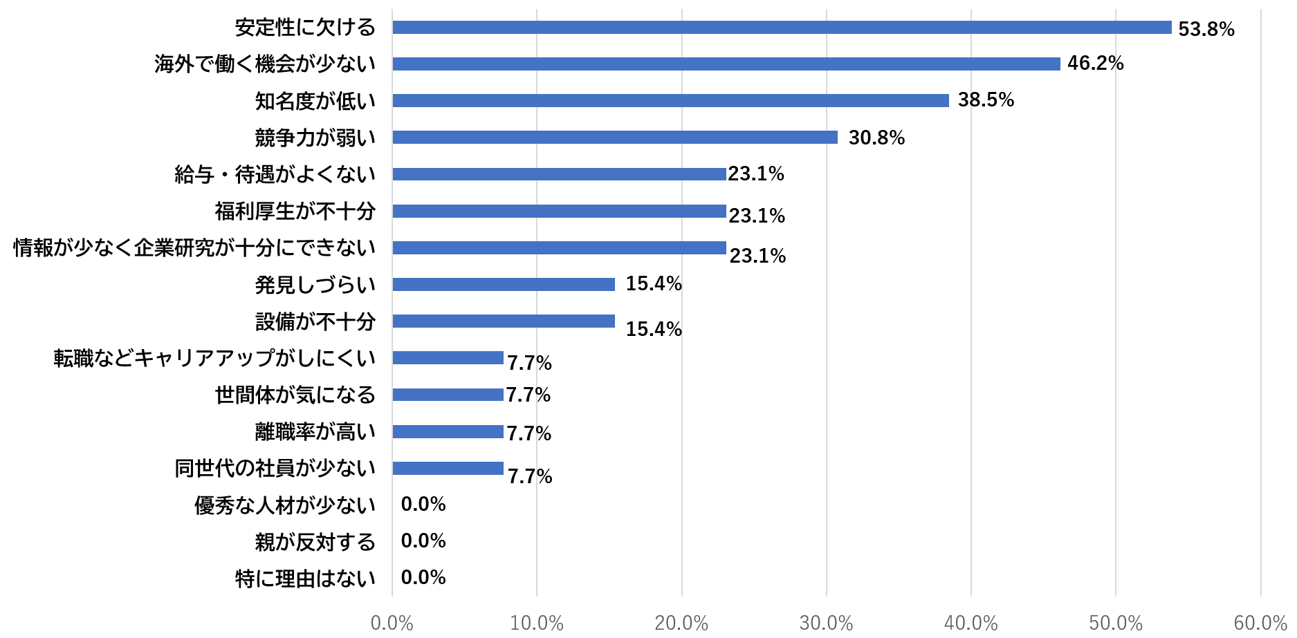 最も多かったのが「安定性に欠ける」7名(53.8%)、次いで「海外で働く機会が少ない」6名(46.2%)、「知名度が低い」5名(38.5%)であった。中小企業は規模が小さいため、大企業よりも海外展開していない、と考える留学生もいたのだと思われる。