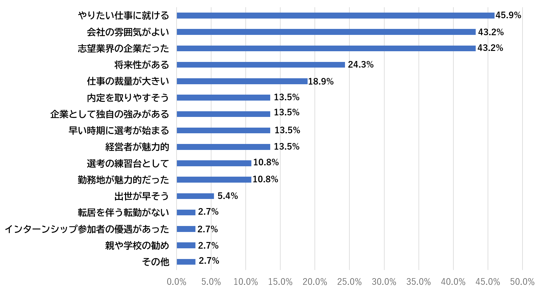 最も多かったのが「やりたい仕事に就ける」17名(45.9%)、次いで「会社の雰囲気がよい」16名(43.2%)、「志望業界の企業だった」16名(43.2%)であった。