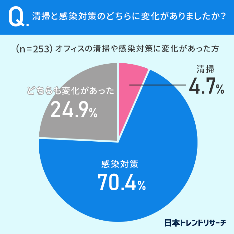 「清掃」に変化があったのは4.7%、「感染対策」に変化があったのは70.4%で、「どちらも変化があった」のは24.9%%でした。