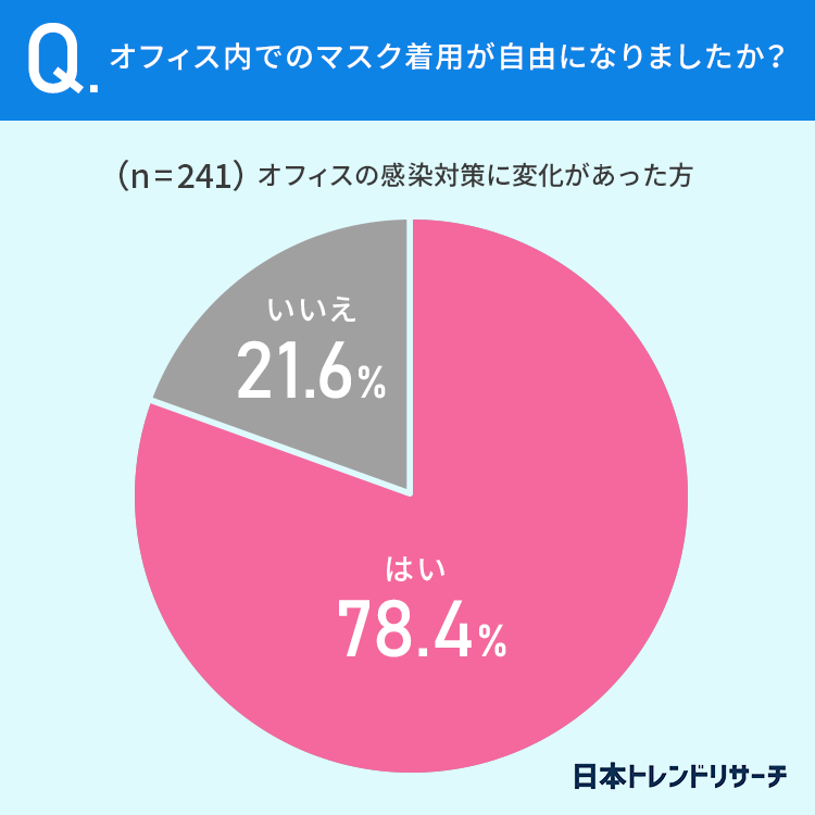 78.4%の方が「オフィス内でのマスク着用が自由になった」と回答しています。