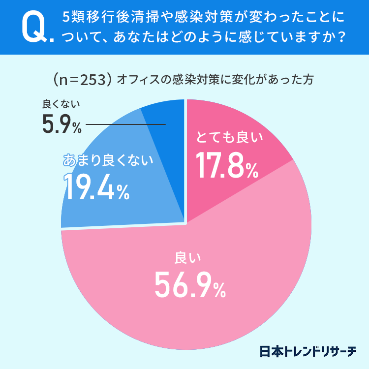コロナ5類移行で感染対策が緩和されて「楽になった」「解放された」と喜んでいる方もいる一方で、オフィスの清掃や感染対策に変化があった方の25.3%が「良くない」と回答しています。
