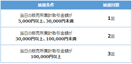 キャンペーン期間中、当日の販売所累計取引金額に応じて抽選に参加できます (獲得した抽選回数は当日のみ抽選可能)。