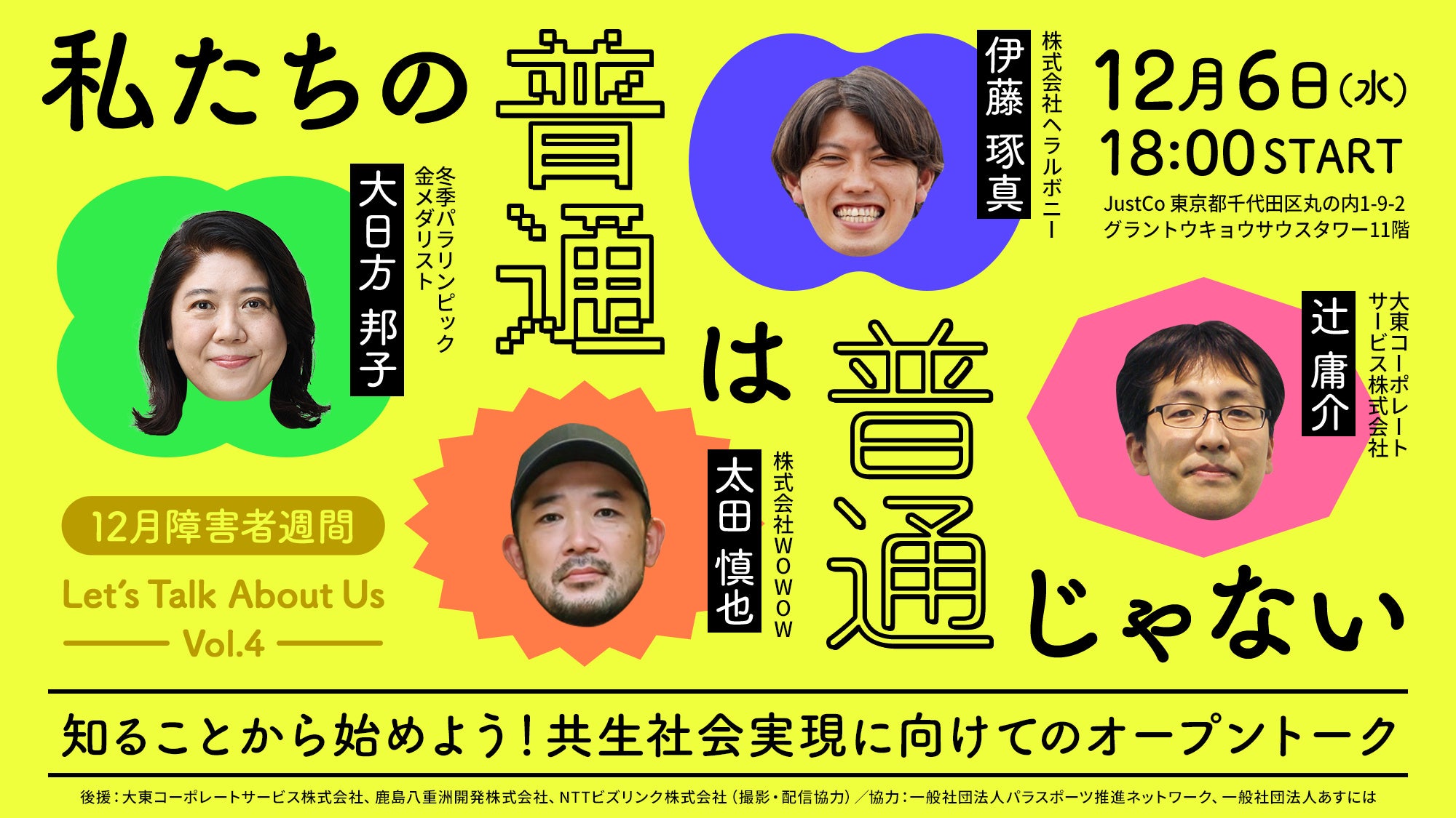 今回のトークイベント「Let`s Talk About Us Vol.4 私たちの普通は普通じゃない」は、大東コーポレートサービス株式会社、鹿島八重洲開発株式会社、そして前回に引き続き、NTTビズリンク(撮影・配信協力)の協賛のもと実施いたします。また、一般社団法人パラスポーツ推進ネットワークならびに選択的夫婦別姓の法制化を中心にジェンダー平等を推進する活動を展開している市民有志「一般社団法人あすには」の事務局長・井田奈穂さんも司会として本イベントにご協力くださいます。