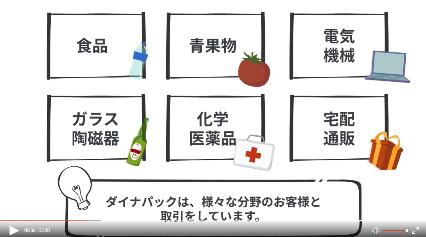 今回のダイナパック紹介動画では、当社の歴史や株主様向け情報、製品情報、社会的な活動などを約3分にまとめています。ダイナパックに興味があるけれどよく分からない…という方々を対象にしており、当社の基本的なプロフィールが短い時間で把握できるようになっています。