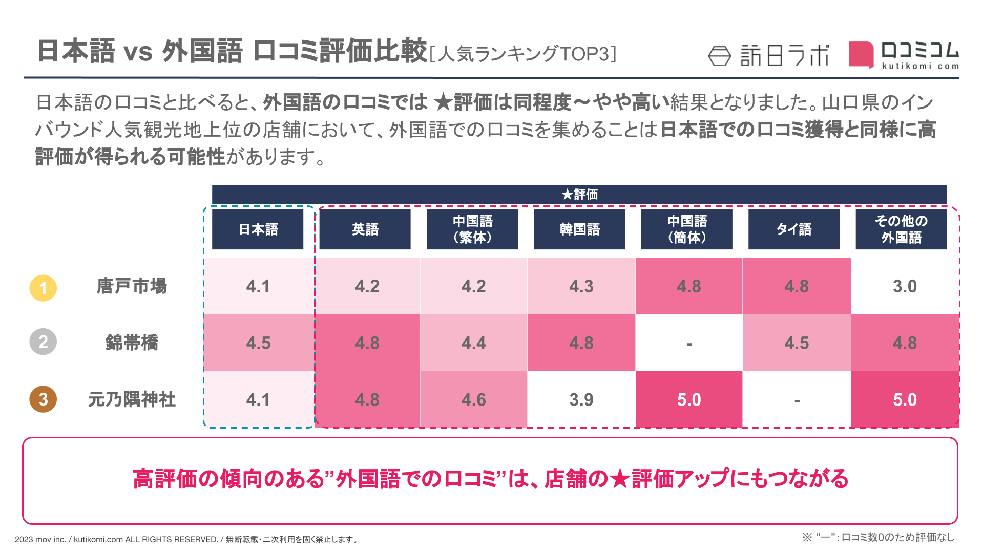 日本語の口コミと比べると、外国語の口コミでは ★評価は同程度〜やや高い結果となりました。山口県のインバウンド人気観光地上位の店舗において、外国語での口コミを集めることは日本語での口コミ獲得と同様に高評価が得られる可能性があります。