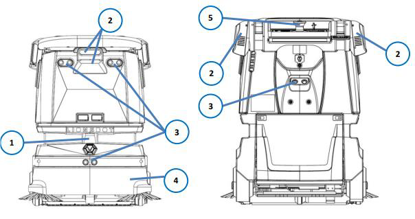 LiDAR 2.深度カメラ(スクラブPRO:5ケ、VAC:4ケ) 3.ソナーセンサー(6ケ) 4.バンパーセンサー 5.緊急停止