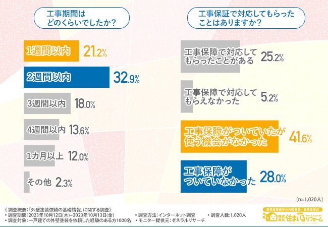 「工事期間はどのくらいでしたか?」と質問したところ、『2週間以内(32.9%)』と回答した方が最も多く、次いで『1週間以内(21.2%)』『3週間以内(18.0%)』『4週間以内(13.6%)』『1カ月以上(12.0%)』と続きました。
